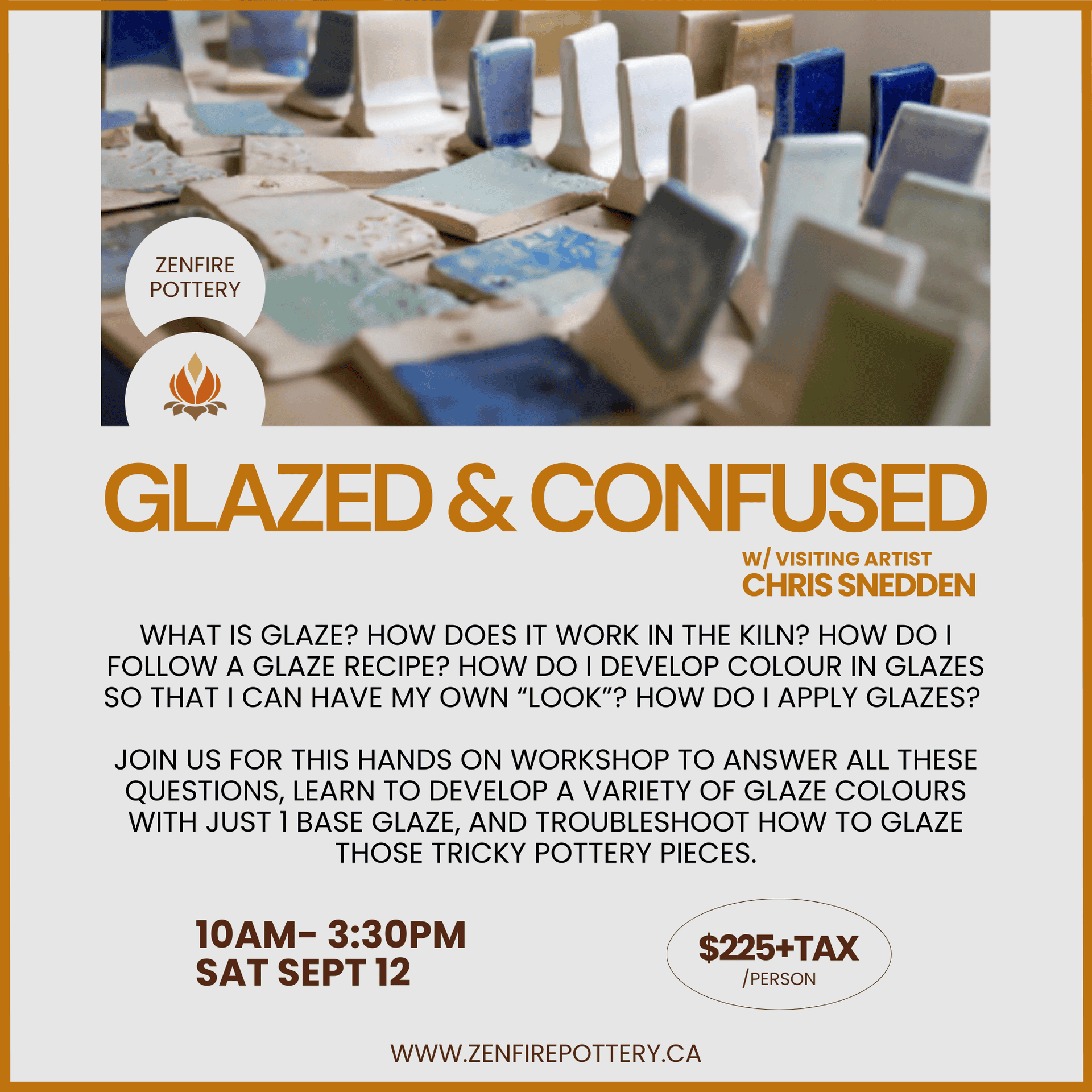 Join us for this hands-on workshop to answer all of these questions. Visiting artist Chris Snedden will be lending his many years of clay and glaze experience to teach participants how to develop a variety of glaze colours with just 1 base glaze. Chris will also troubleshoot how to glaze those tricky pottery pieces for a perfectly glazed finish.