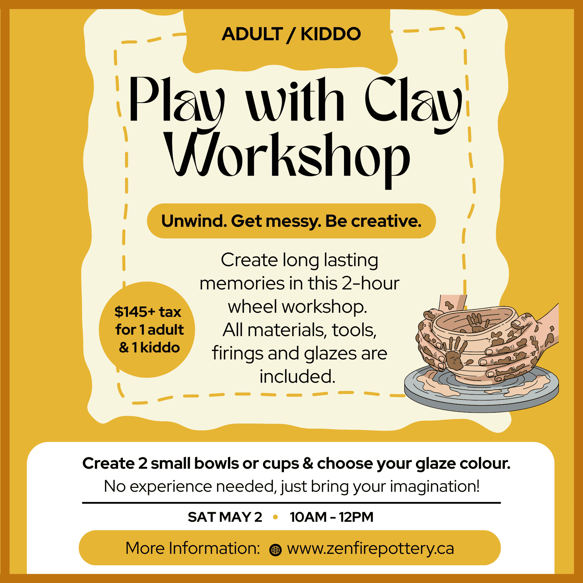 These workshops are a great opportunity to see if this is your next hobby, or simply cross off your bucket list! You will be guided through making 2 cups or bowls. You will get the full experience of centering the clay, building the foundation of your pot to then stretch the sides and see how high you can get it!